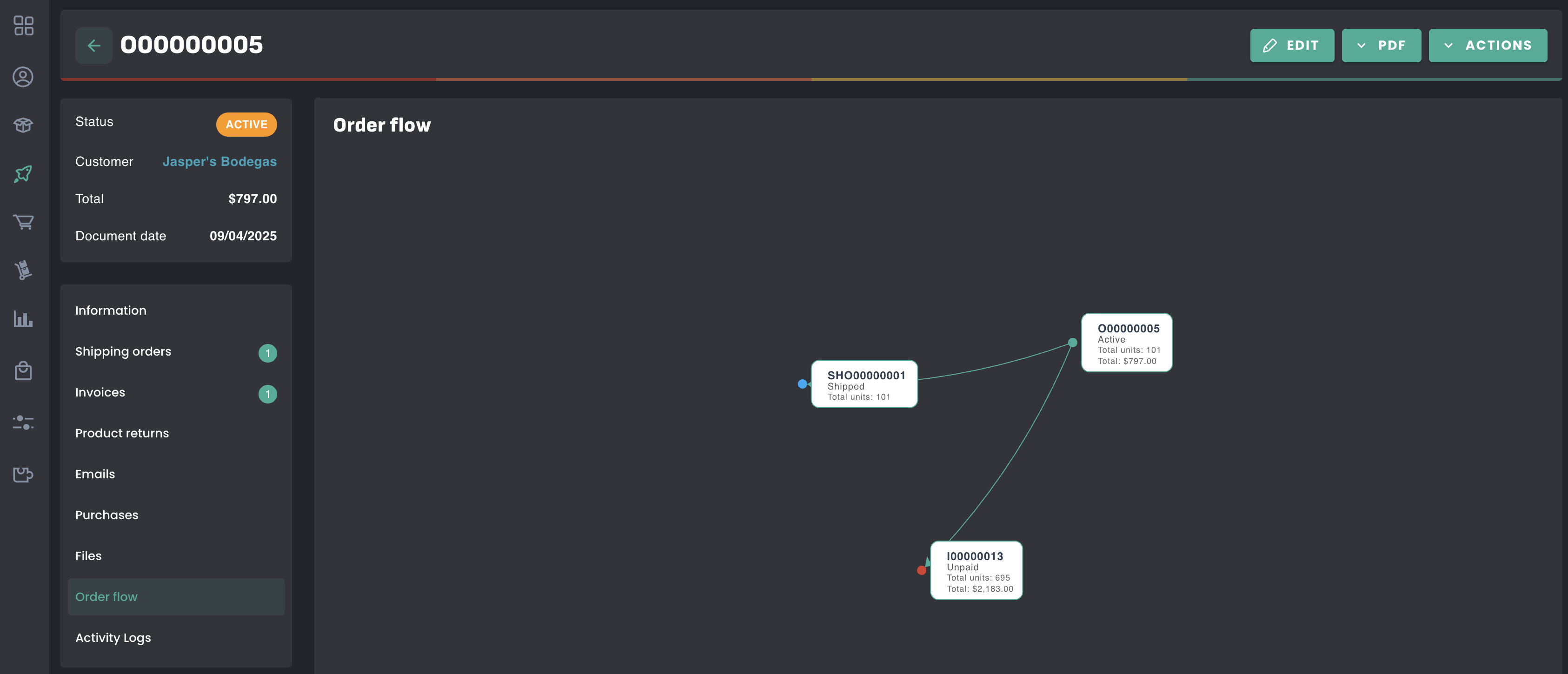 A new Order Flow is now available on sales orders. It provides a visual overview of all transactions linked to an order, along with their status and progress.