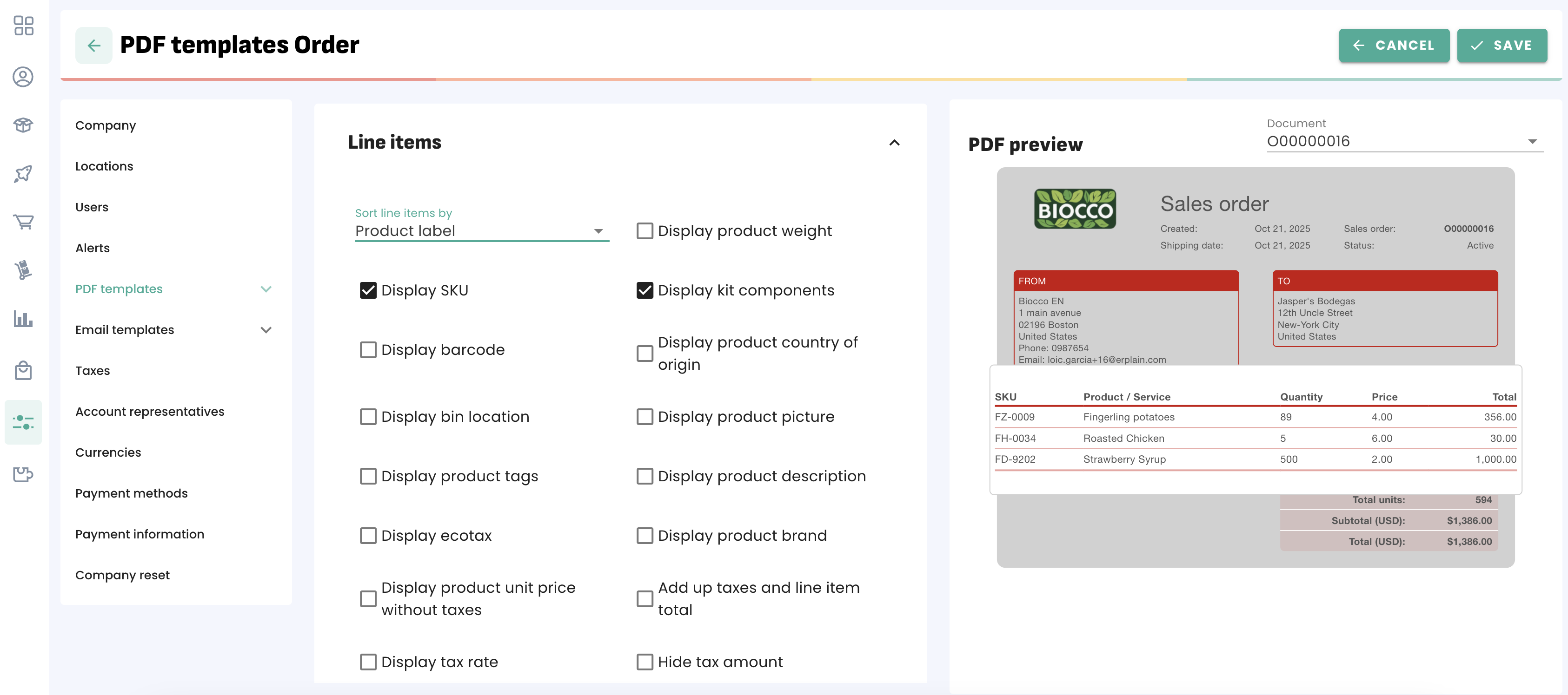 PDF settings have been replaced by customizable PDF Templates that can be edited in real time within the interface. You can create multiple templates for each document type and instantly preview the impact of every change.