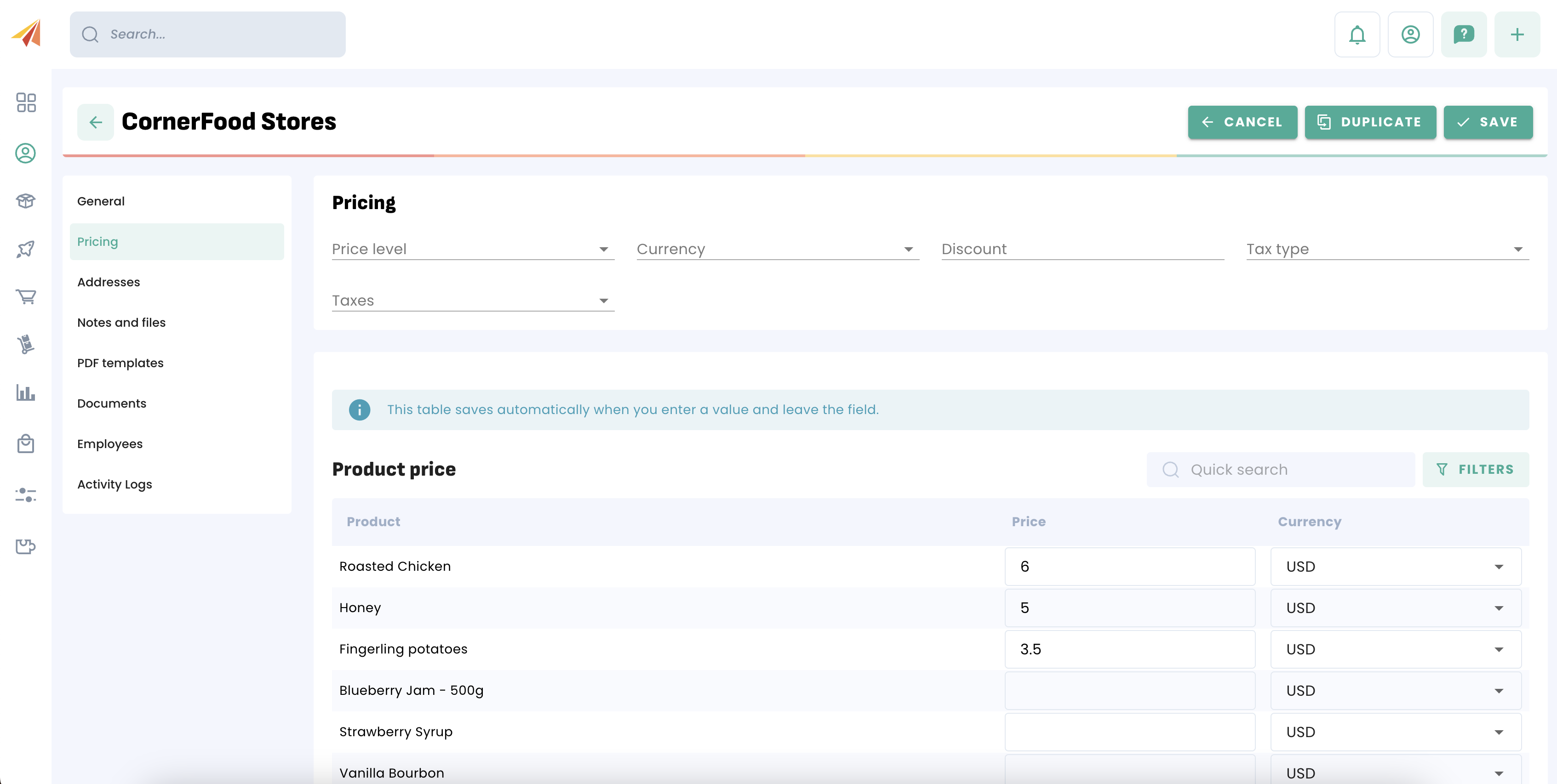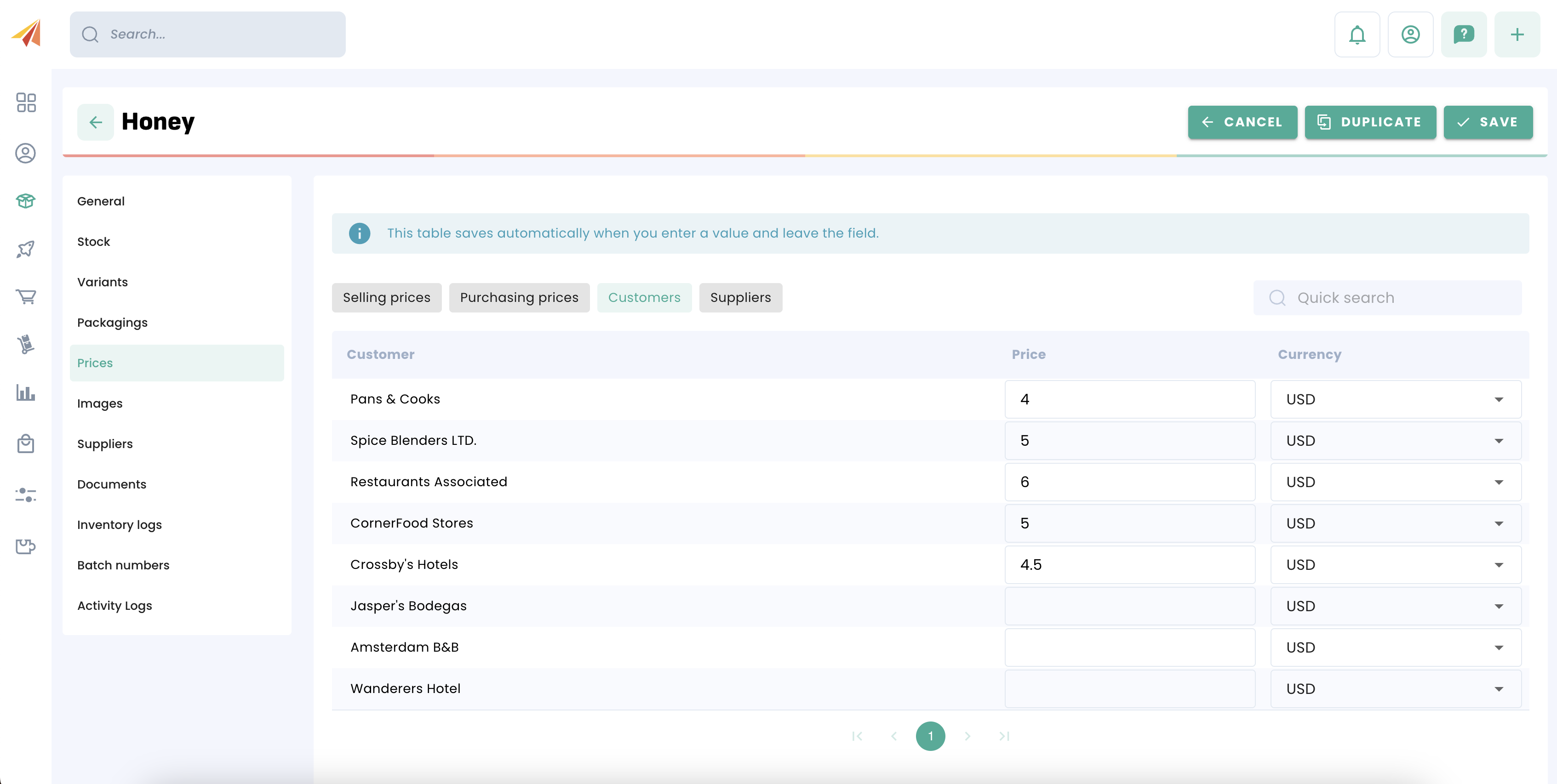 Once in the menu, you can click on Customers or Suppliers and set a specific price for each product for each customer or supplier.