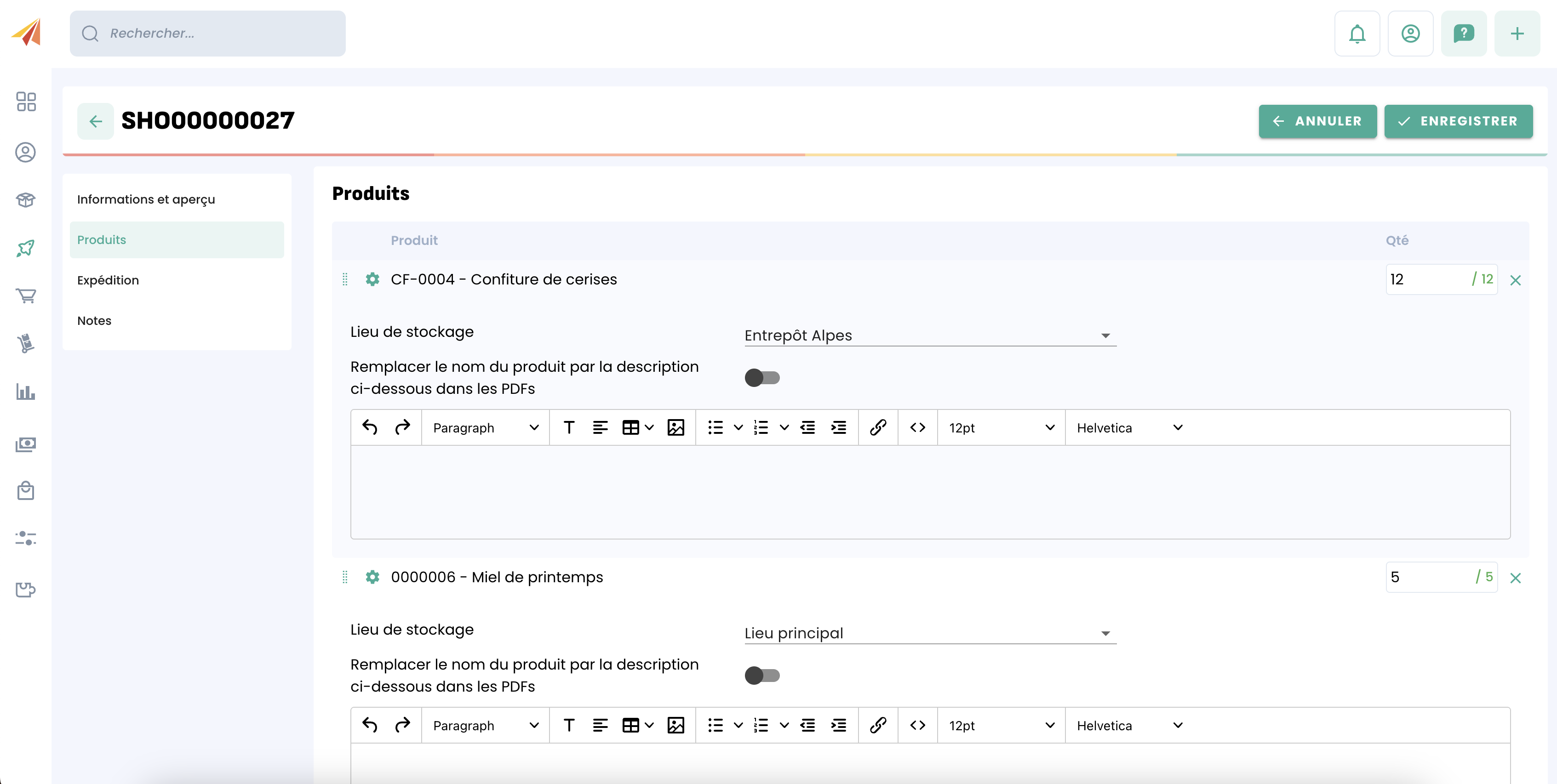Dans le bon de livraison, ajuster les produits ou quantités à expédier depuis ce lieu de stockage. Vous pouvez ajuster vos quantités ou retirer des articles en les décochant.