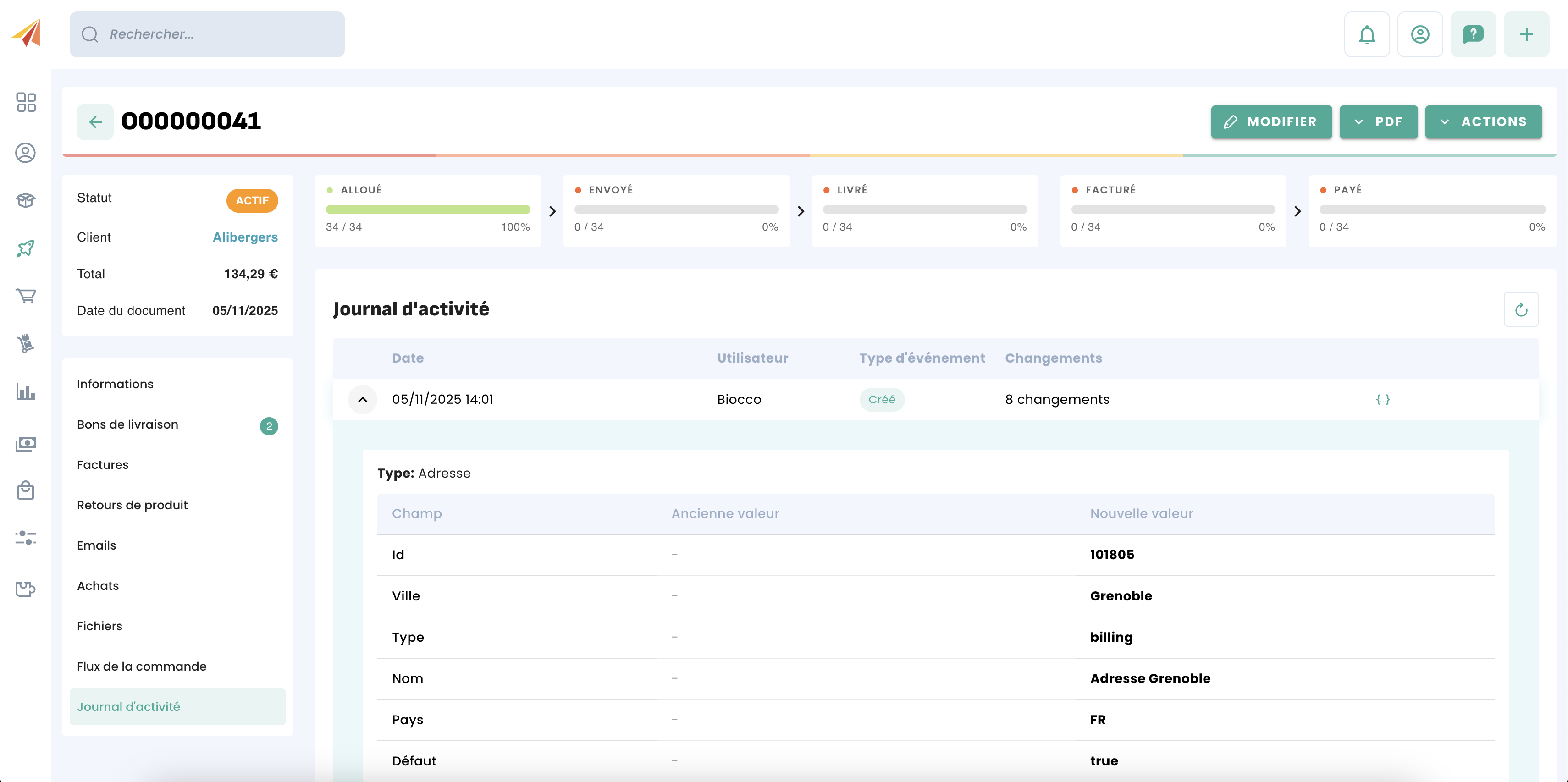 Un journal d'activité est maintenant disponible sur les fiches produits, clients, fournisseurs mais également les documents. Ce journal recense les modifications apportées sur chaque page, avec la possibilité de voir le détail des changements mais aussi d'en extraire le code JSON.
